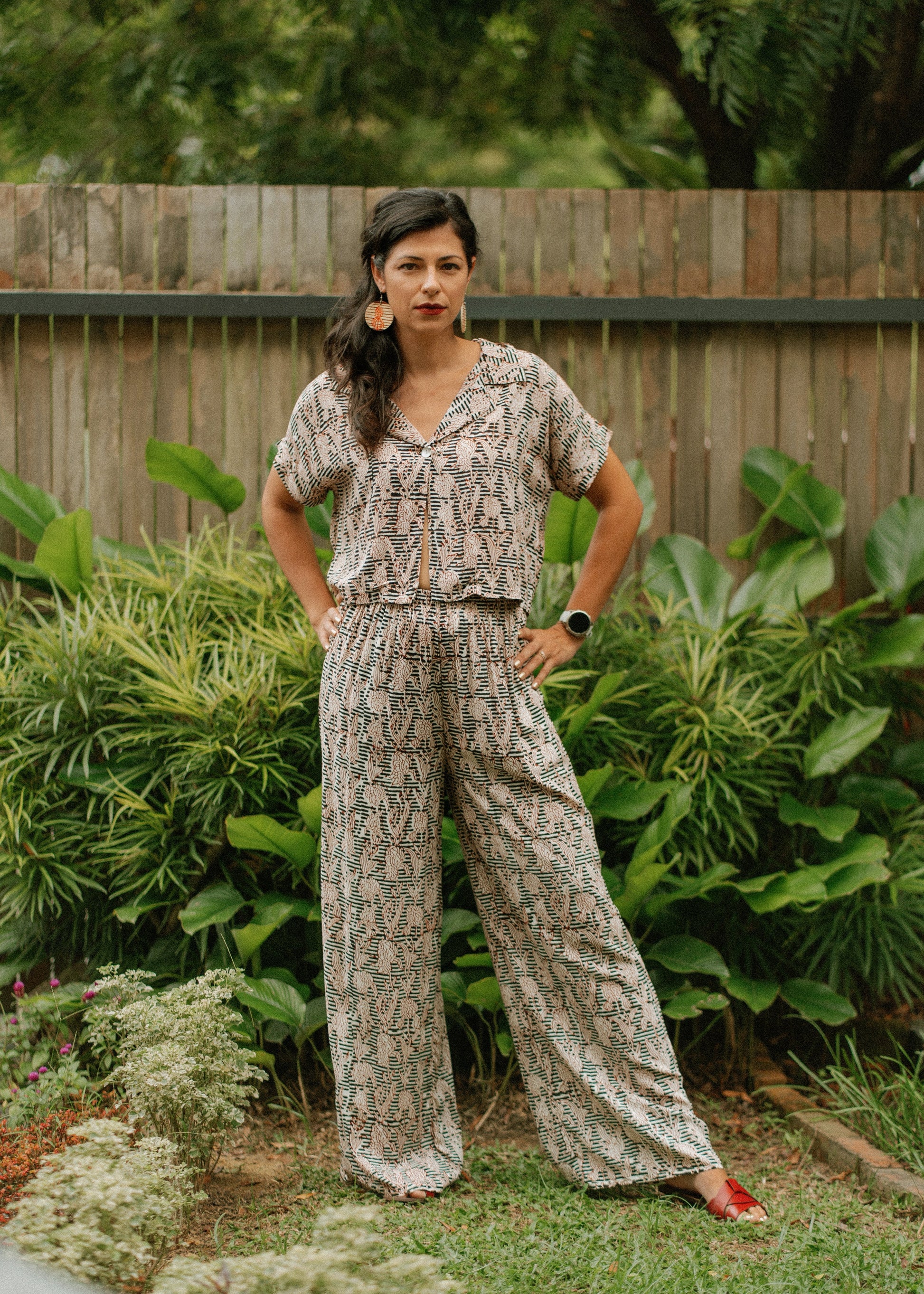 Crafted from a soft cotton-viscose blend, these wide-leg pants are designed for effortless comfort and movement. Featuring pockets and an elastic waistband, they offer a relaxed yet refined silhouette. Pair them with the matching top to complete the look — an easy ensemble that transitions seamlessly from lounging to lunch dates.